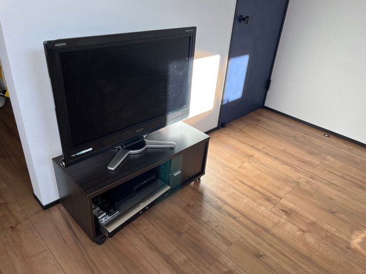 布団を片付ければほぼ何もない空間に。何かあったときにすぐ情報を得られるよう、テレビは置いています。