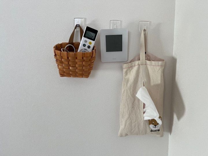 リモコン類やティッシュなどは、壁にフックを取り付けて引っ掛けて収納しています。