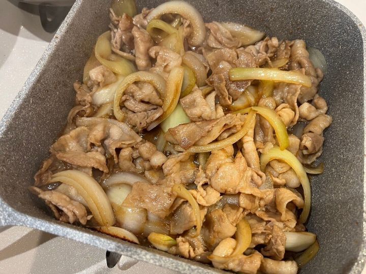 何を入れるかは家庭にもよるかと思うのですが、わが家では薄切りの豚バラ肉に玉ねぎも加えて作ります!