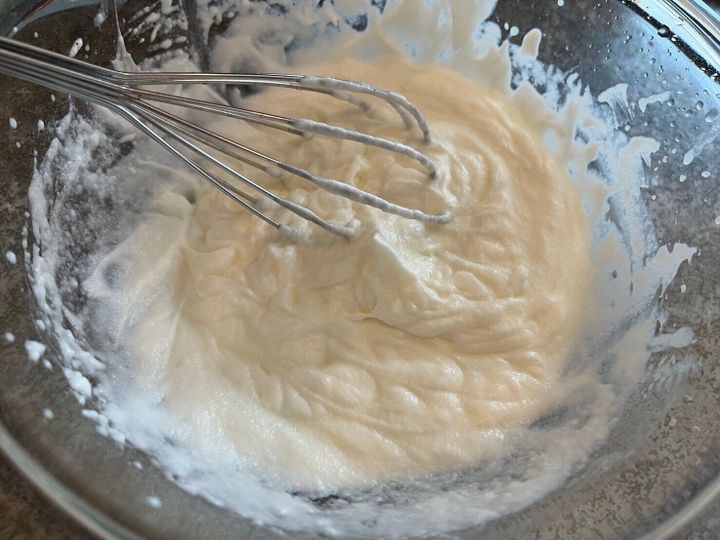 生クリームほどの固さは出ないものの、しっかり泡立てればある程度の固さのクリームになりました!