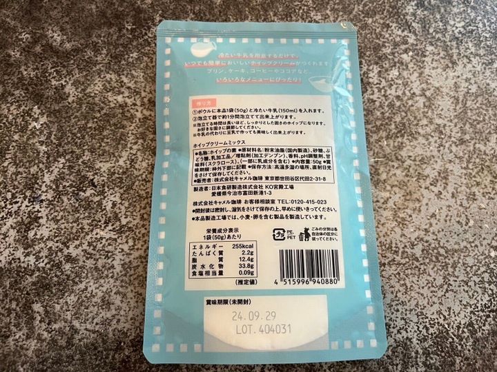 KALDIのホイップクリームミックスは、粉末状で保存期間も長め。