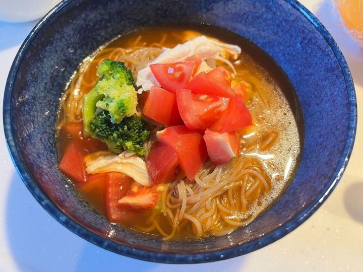 付属のスープを150mlの冷水で薄めて、お好みの具材とともに盛り付ければ完成です。