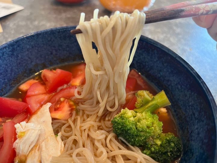 細いながらも弾力のある麺は食べごたえがあり、スープがよく絡みます。