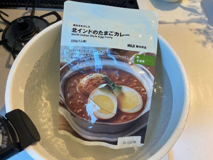 沸騰したお湯の中にパウチを入れ、5〜7分温めます。