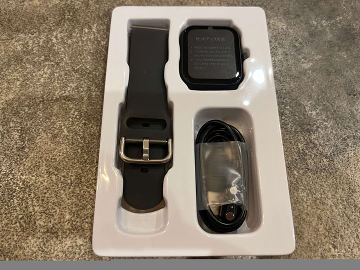 箱の中には付け替え可能なベルトが2セット(ブラック・クリアブラック)と、USB充電ケーブルが入っていました。別売りのベルトに付け替えも可能なので、好みやファッションに合わせて選ぶのも楽しいですね。