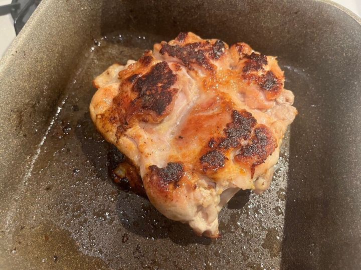 15分経ったら中火で熱したフライパンにサラダ油を入れ、鶏肉を片面4分ずつ蓋をして焼きます。下味パウダーをまぶした鶏肉は、焦げやすいので様子をみながら火力を調整してくださいね。お肉が焼けたら火を止め、ハニーマスタードソース1袋を入れて鶏肉に絡めたら完成です!