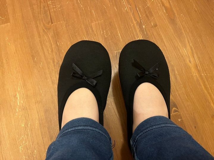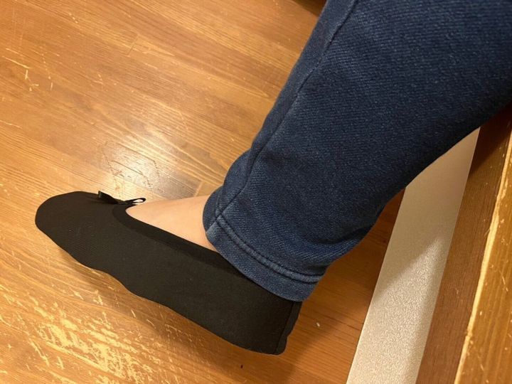 かかとまですっぽり覆われるバレエシューズ型なので、通常のスリッパのように歩いているうちに脱げてしまうこともありません。歩きやすいので、移動が多い場面でも役立ちそうです。
