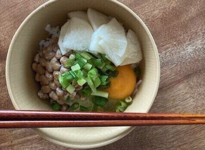 漬物と生卵を合わせて丼に、納豆入りの卵焼き