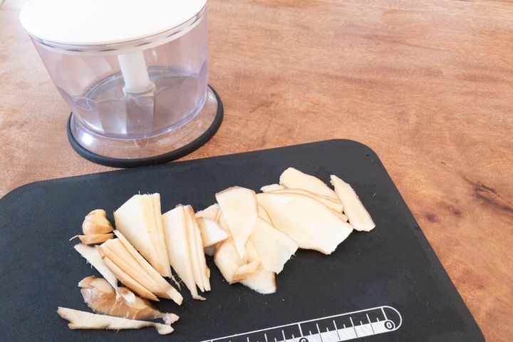 まず生姜をきれいに洗って皮付きのまま薄くスライスし、フードプロセッサーにかけます。フードプロセッサーが無い場合は包丁でみじん切りや千切りにしてもよいです。