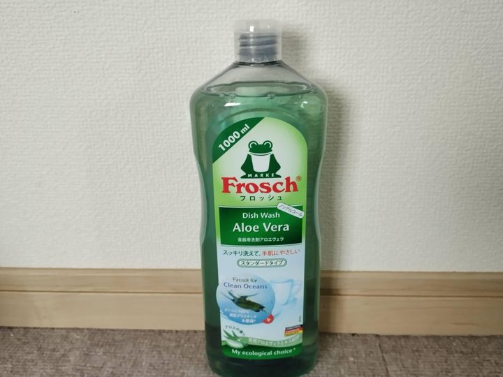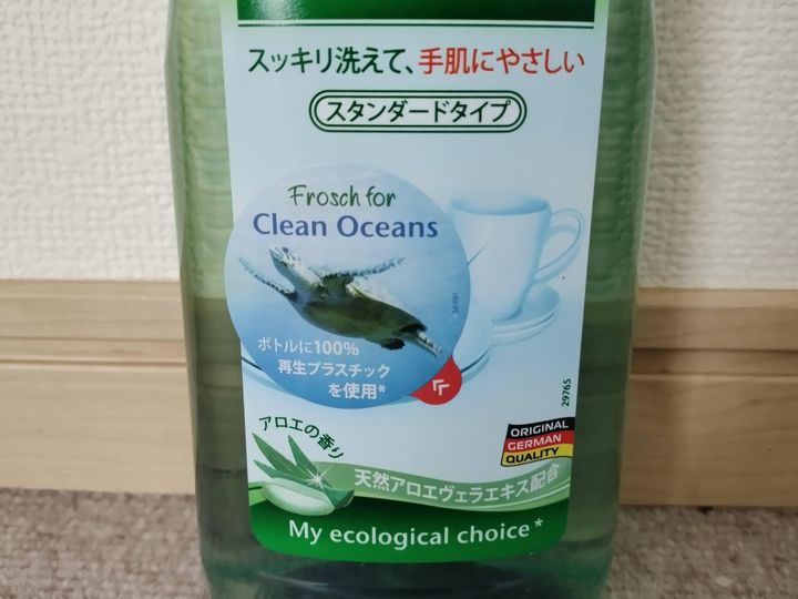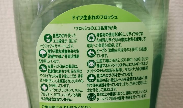 フロッシュといえば、かえるのマークが目印のドイツの洗剤です。贈答用などでも人気の洗剤ですね。購入する前は知らなかったのですが、フロッシュは環境に配慮した洗剤なんです。環境に優しい洗剤というと洗浄力が気になるところですが、ヒマワリや菜の花など植物由来の界面活性剤を使用しているそうです。またボトルはリサイクルされたプラスチックを使用しているとのこと。