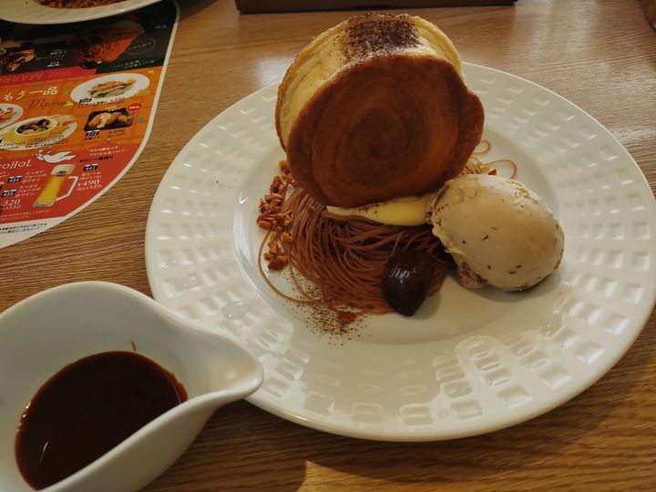 「くるくるデニッシュと渋皮栗アイス(税込649円)」はあったかいデニッシュパンに栗ペーストや渋皮栗アイスなどが添えられたスイーツです。デニッシュパンが大きくて食べごたえ抜群なので、満腹時は避けるのが無難かもしれません。温かいデニッシュパンとアイスを一緒に食べたり、栗ペーストと一緒に食べたり、さまざまな楽しみ方ができるスイーツです。キャラメルソースも付いてきますが、結構甘みがあるので、様子を見ながらかけてみてくださいね。