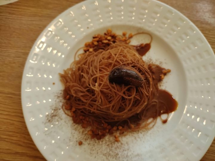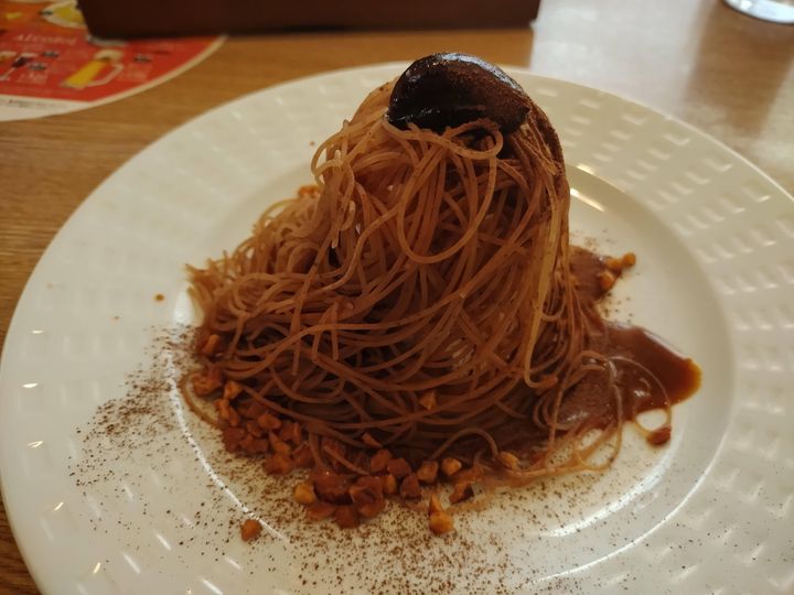 ココスの「イタリア栗のしぼりたてモンブラン」はなんと税込605円。多くのお店で1000円以上でて供されているあのクリームが細くしぼられたモンブランがこのお値段で食べられるのは、かなりお得です!どっさりとお皿に乗った栗ペースト。中はパイ生地、カスタードクリーム、栗アイス、ホイップが入っていました。一番上には栗がトッピングされています。