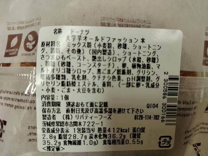 大学芋みたいなオールドファッションは税込140円ととってもリーズナブル。手に取りやすい価格でとっても嬉しいですが、カロリーは1つあたりと412kcalと高めです。食べごたえがあるので、おやつや朝食などにも良さそうなドーナツです。