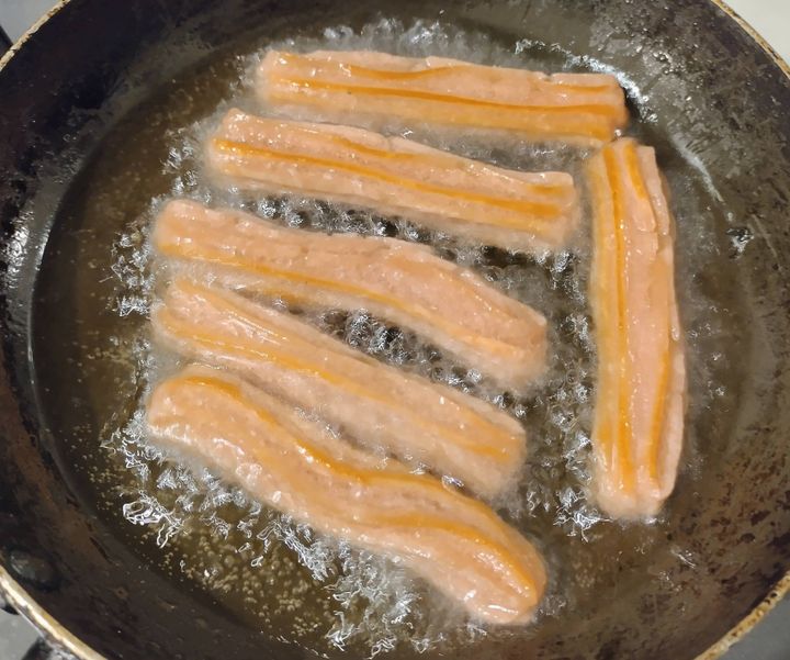 油に投入するのは、油の温度が上がってからにします。油を入れる際には、チュロスがくっつかないように1本1本離して入れる必要があります。