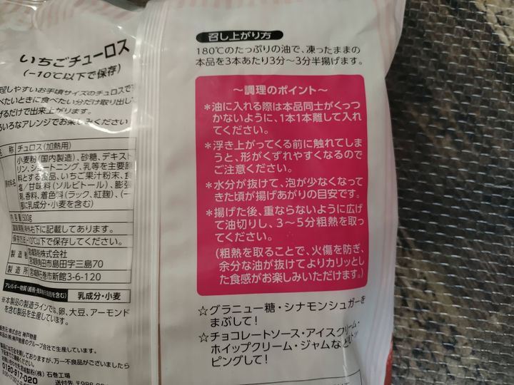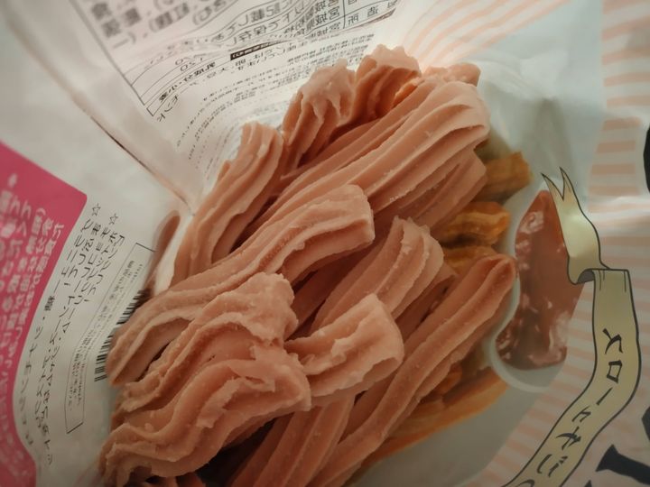 1袋税込181.44円でした(※筆者購入時)。少しずつ値上がりしているようですが、それでもとっても安いですよね!業務スーパーで販売しているチューロスには、プレーンとチョコ、いちごがあります。今回はいちごを購入しました。