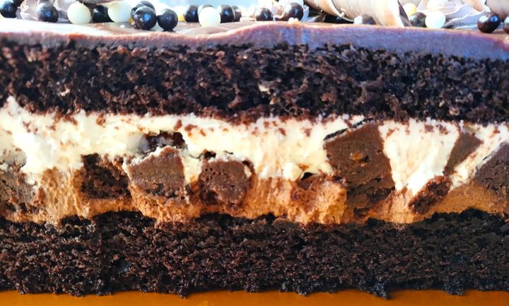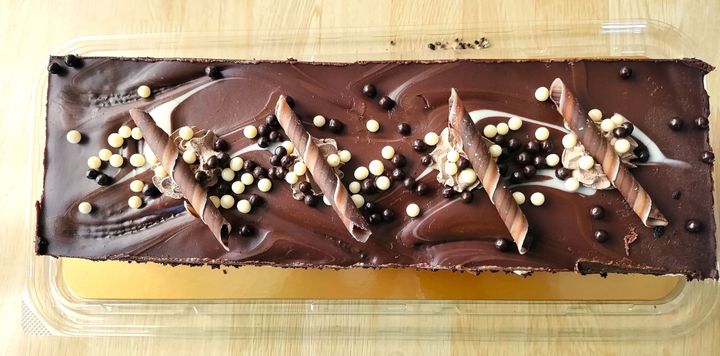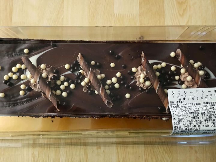 昨年より値下がりしたタキシードケーキですが、値段以外に変わった点が1つあります。それは、トッピングが少なくなったこと。昨年までのタキシードケーキは一番上にチョコレート菓子がたっぷりとトッピングされていました。