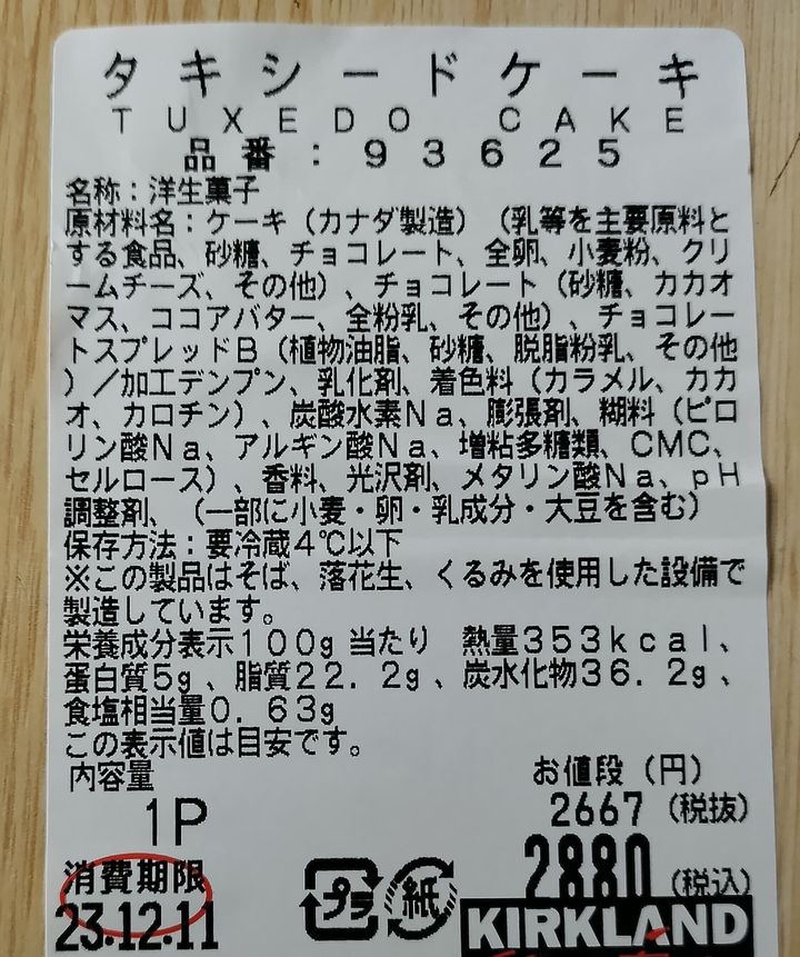 タキシードケーキは、税込2880円です。筆者はタキシードケーキが好きなのですが、去年は買わなかったんです。なぜなら、2022年のタキシードケーキは税込3580円とコストコのケーキとしては高額だったから。去年は悩んだのですが、購入を見送りました。しかし今年は多くのものが値上がりしているのに、なぜかタキシードケーキだけは値下がり!これは買うしかないですよね!