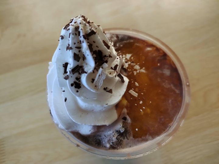 まずはこちらの「ショコラオレンジフラッペ」から。チョコレート味のフラッペに、オレンジソースとホイップクリーム、削ったチョコレートとホワイトチョコレートがトッピングされています。