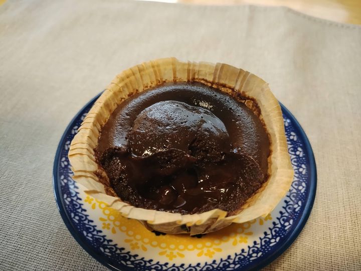 表示通りに温めると、真ん中トロトロのフォンダンショコラの完成です。周りの生地も柔らかくてなめらか。口に入れると甘みが強く感じますが、後味にほどよい苦みも感じます。ブラックコーヒーがよく合うスイーツです。