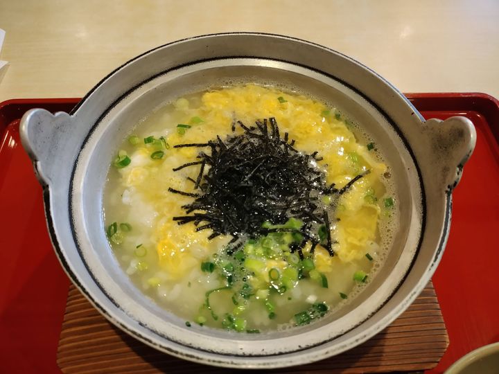 寒い朝にも体を温めてくれる玉子雑炊朝食のカロリーは349キロカロリー。かきたまがかかっていて、朝からたんぱく質もしっかり取れます。