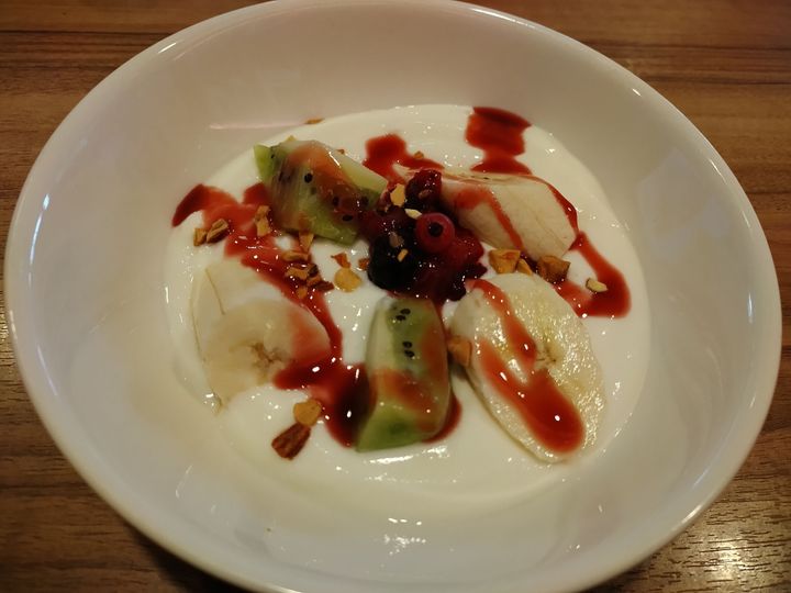 しかし、ヨーグルトには大きめにカットされたキウイとバナナが入っていて、意外と食べごたえがあります。ミックスベリーやアーモンドもよいアクセントになっています。