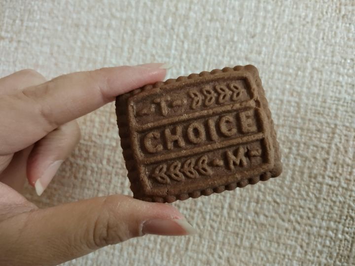 続いて「チョイスバターショコラ」。チョイスと言えば、バターの芳醇な香りを楽しめるビスケット。チョイスバターショコラは、バターとチョコレートの風味を同時に楽しめるビスケットです。サクサクとしたチョイスのよさを生かしたココアクッキーといった印象です。