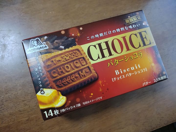 そしてチョコレート色のムーンライトの隣には、同じ森永のビスケット「チョイス」がチョコレート色になっていました。こちらもつい放っておくことができなくて、購入してしまいました(笑)。