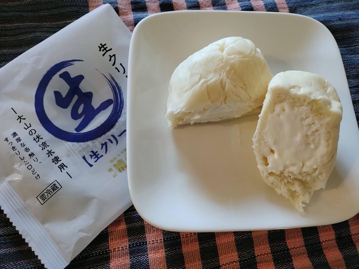 素材にとてもこだわっており、鳥取県の大山(だいせん)の伏流水を使用しているとのことです。やわらかくてしっとりした生地の生クリームパン。生地はしっとりしているだけでなく、ややもちっとしています。