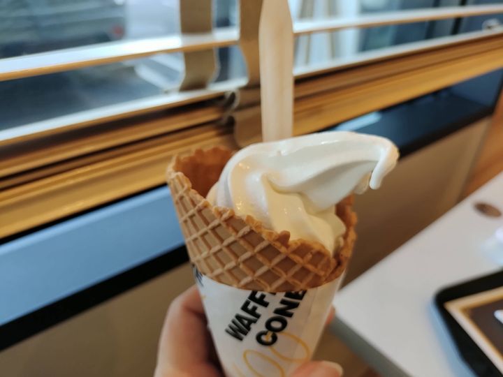 ソフトクリームの「ワッフルコーン」も今回販売終了したメニューの1つです。写真に写っているのはワッフルコーン プレーンですが、プレーンのほかに「ワッフルコーン チョコ&アーモンド」と「ワッフルコーン ストロベリー」もありました。