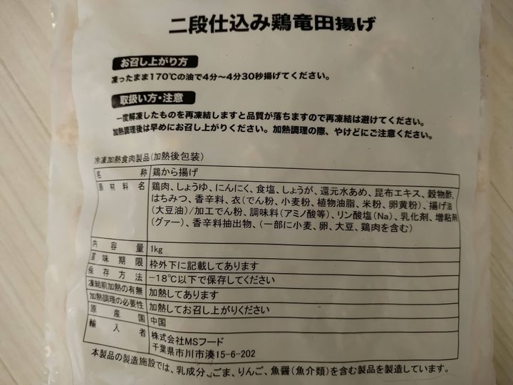 先日筆者が業務スーパーで購入したのはこちらの「二段仕込み鶏竜田揚げ」。1キロの大容量で価格は950.4円(※2024年3月筆者購入時の価格)です。原産国は中国ですが、MSフードという千葉の会社が販売している冷凍竜田揚げです。