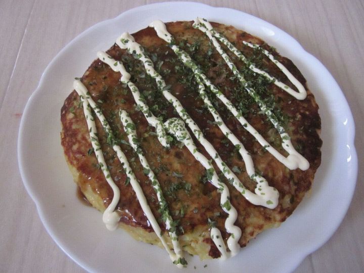 しっとりふわふわした食感のお好み焼きです。ときおりイカのぷりぷりした食感を感じます。小麦粉で作られたお好み焼きと少し違う感じがしますが、キャベツがたくさん入っていて、シャキシャキしています。筆者はソースとマヨネーズで食べましたが、ポン酢も合いそう。