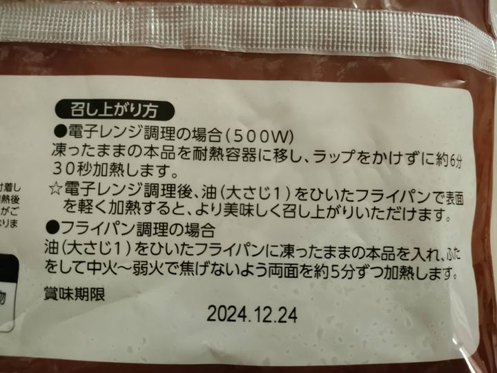 電子レンジ調理の場合は、500wで6分30秒温めるそうです。電子レンジ調理だけでも食べられますが、そのあとにフライパンでさっと焼くとよりおいしくなるそうですよ。