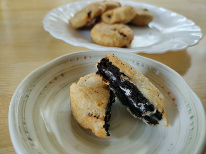 そのまま食べても充分おいしいオレオを、天ぷらのように揚げたレシピなんです。インドネシア人は揚げ物が大好きなのですが、オレオまで揚げちゃうんだ!と最初は驚きましたが、興味本位で買ってみたところおいしかったのでそれ以来おうちでも作っているレシピです。