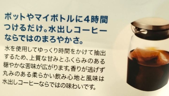 最も簡単な作りかたが、コーヒーバッグを水に浸けて冷蔵庫で冷やすだけの方法です。パッケージ裏に書いてある説明によると「250〜500ミリリットルの水にコーヒーバッグ1つをつけて4時間冷やす」と書いてあります。