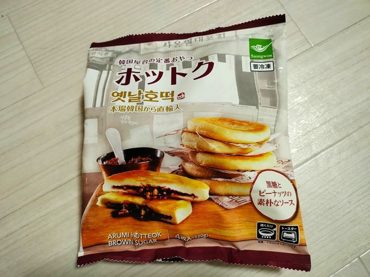生地から作るとかなり手間がかかるホットクも業務スーパーなら、冷凍のものを買えちゃいます。パッケージ表の「ホットク」の文字の下に書いてある韓国語は「イェンナル・ホットク(昔ながらのホットク)」と書いてあります。