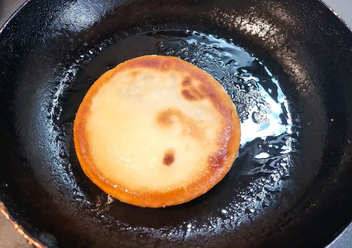 フライパンで焼いていただきます。韓国の屋台では、ホットクは鉄板で焼くというより油多めで揚げているのを見かけるのですが、このSaongwonのホットクは薄めの油でも十分に焼けます。