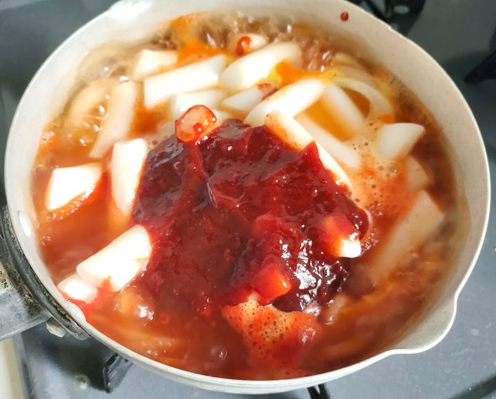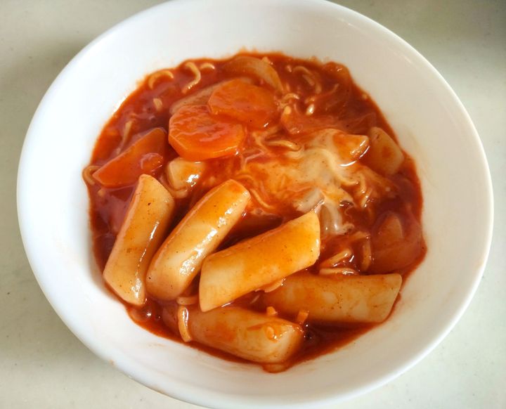 作りかたはとても簡単で、具材(キャベツ、玉ねぎ、人参など)と袋に入っているトック(韓国餅)とソースを一緒に煮るだけです。