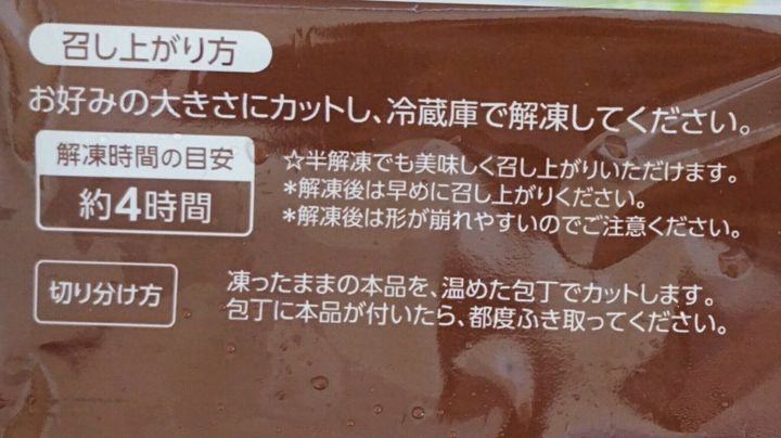 なおパッケージの横の説明によると、凍ったままでカットするとのこと。うっかりして冷蔵庫で解凍してしまいましたが、解凍されている状態でも問題なくカットできました。
