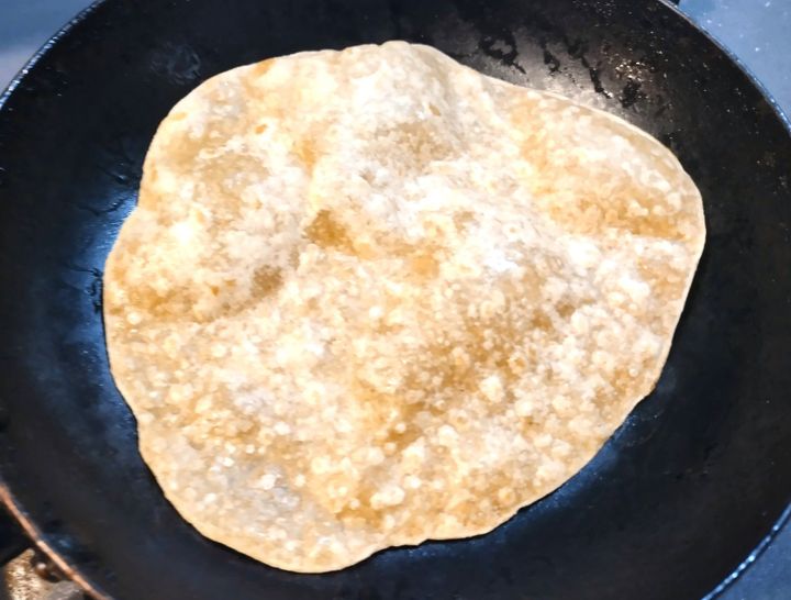 凍ったままのチャパティをフライパンで焼いていきます。フライパン以外にはトースターでも調理できるようです。同シリーズのパラタと同様に、こちらもチャパティ1枚1枚の間にフィルムが入っており、取り出しやすいのがとてもありがたいです。