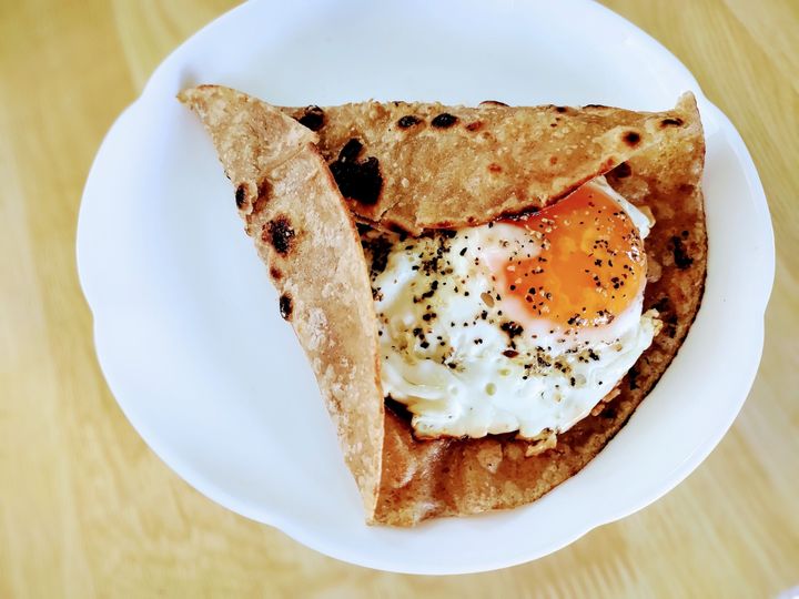 チャパティはパラタよりも薄いので、何かを巻いて食べるのにピッタリです。オイル少なめのシンプルな味わいなので、目玉焼きとツナを乗せてガレット風にしてみました。ハムやチーズ、野菜など好きなものを入れて楽しめそうです。