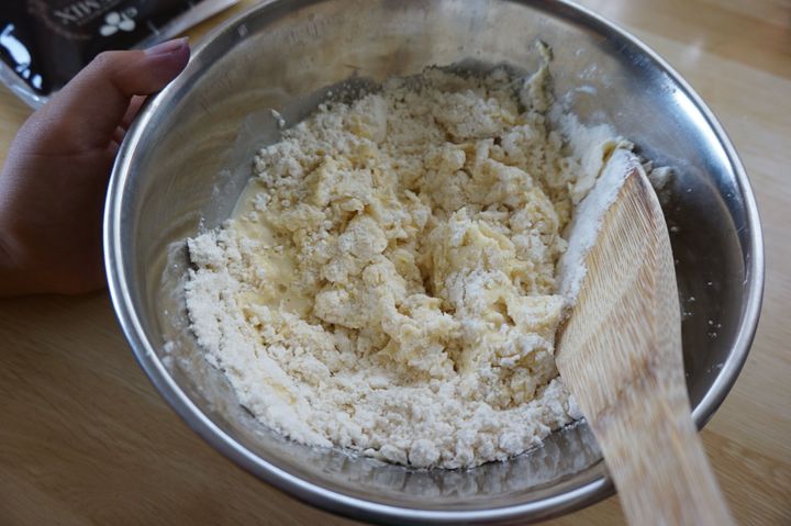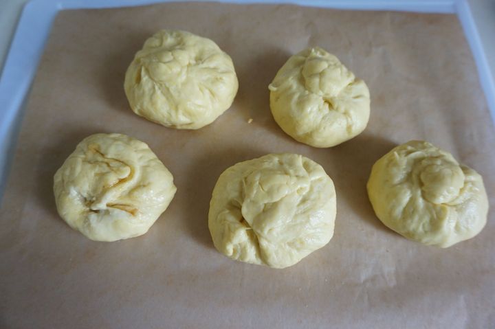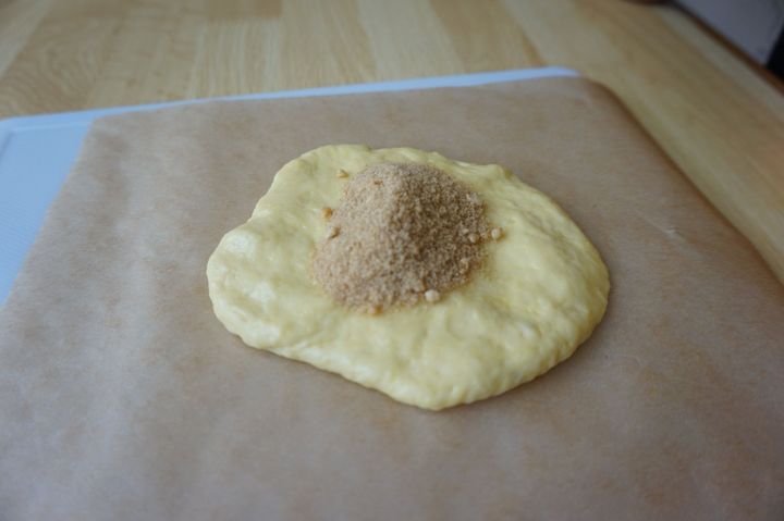 しっかり混ざったら生地を5等分にし、平たく成形します。シナモンシュガーを生地の中央に乗せ、肉まんを包むように包んでいきます。
