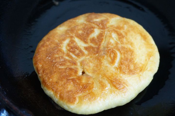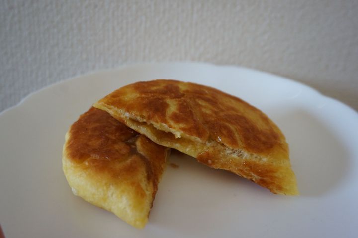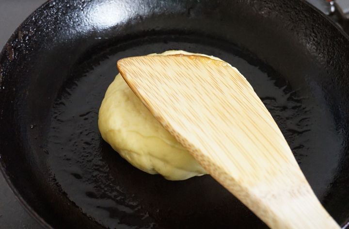 生地が焦げやすいので、焼くときはご注意ください。よく韓国の屋台では、大きなスタンプのような器具(ホットックプレスというそうです)で生地を押してぎゅーっと平たくしているのを見かけますが、もちろんその器具は我が家にはないので、木べらで代用しました。