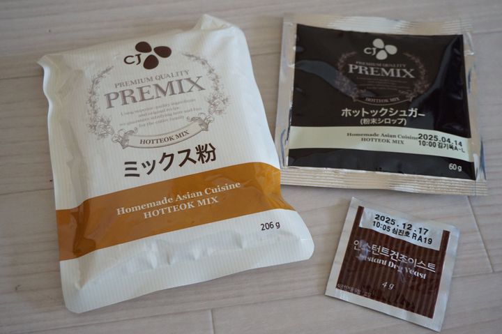 今回購入した「CJホットックミックス」のお値段は、税込398円です。箱の中にはミックス粉206グラム、ホットックシュガー60グラム、ドライイースト4グラムが入っています。1箱で5つのホットクが作れるそうです。