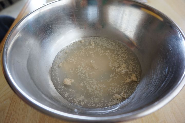 それでは早速作っていきます。今回は小学5年生の息子と4歳の娘に手伝ってもらいました。まず、120ccのぬるま湯をボウルに入れます。ぬるま湯はお風呂の温度と同じくらいの温度とのことでとてもわかりやすいですね。