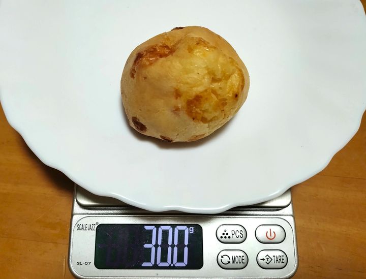 こちらがロピアの「ポンデケージョ」です。重さを測ってみたところ、筆者が購入した袋に入っていたポンデケージョは1つ30〜32グラムのものが多かったです。