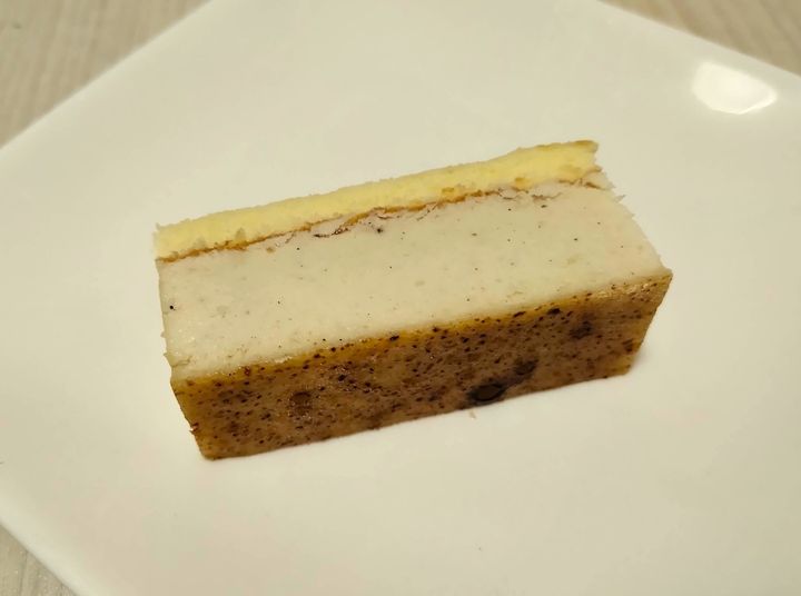 チーズはクリームチーズとチェダーチーズの2種類を使用しているそうです。チーズケーキブリュレということで、表面は少し炙って焼き色がつけられています。