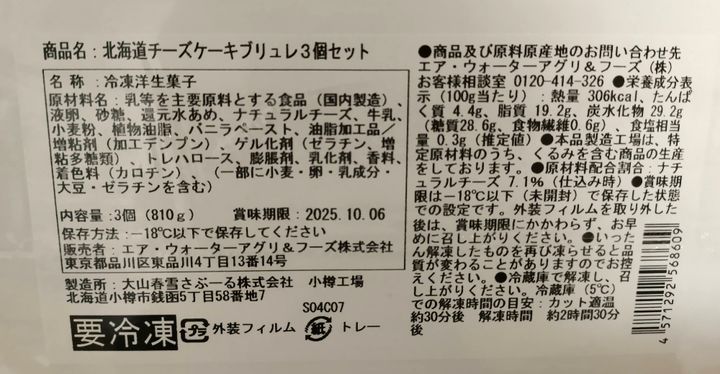「北海道チーズケーキブリュレ」は、大山春雪さぶーる株式会社という日本の会社が作っている国産のチーズケーキです。コストコの冷凍コーナーにあるケーキで、3箱セットになっています。価格は1セット(3箱)で税込1,848円(※2025年3月筆者購入時)。