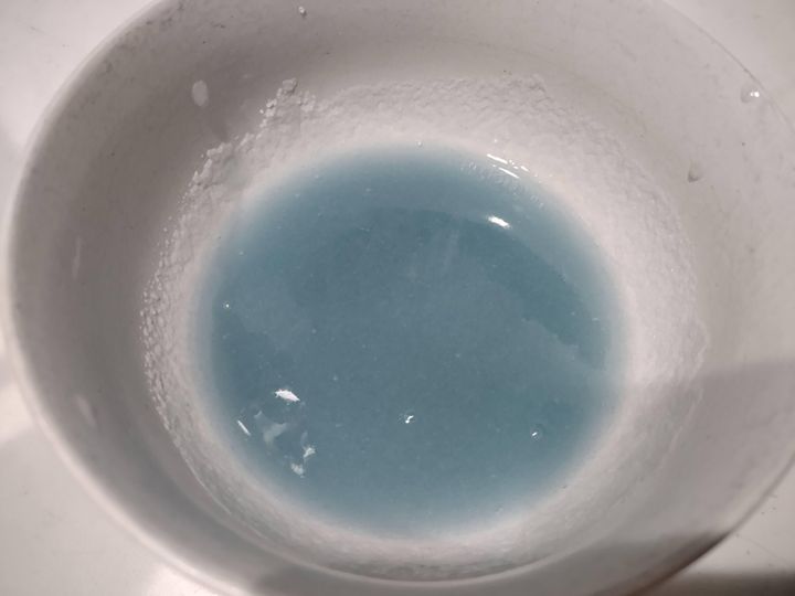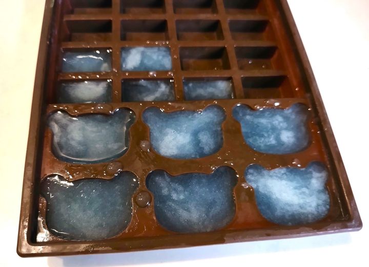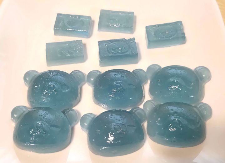 固める前は少し色にムラがあるように見えましたが、冷蔵庫で冷したあとに型から外すときれいな水色のグミができていました。