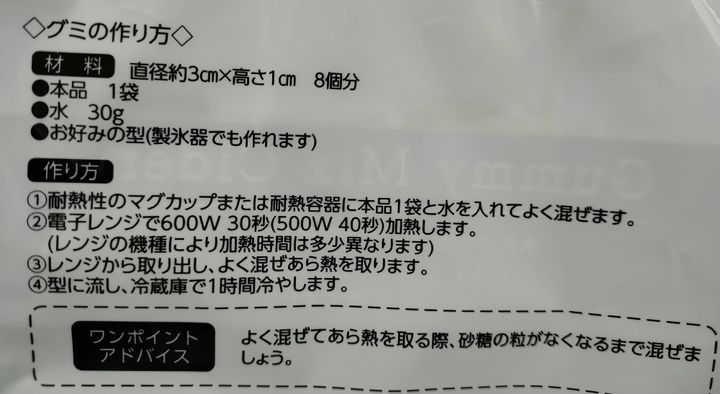 子どものお菓子作りデビューにもぴったりなセリアの「グミミックス粉」。用意するのは水と型だけなので簡単に作れますよ。また、使用する調理器具が電子レンジのみで火を使用しないため、子どもでも比較的安全に作ることができます。