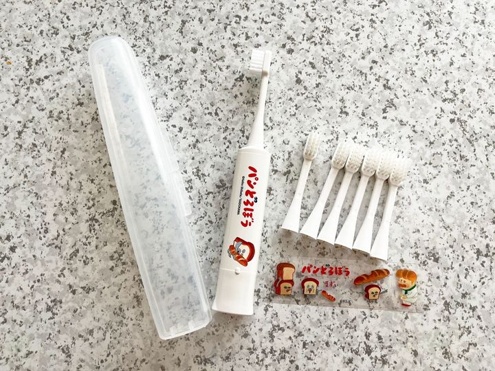 「こどもハピカ はじめてセット」の内容は、ハピカ本体(ブラシ付き・電池入り)・替えブラシ6本・ケース・シール。替えブラシは通販でも2本で税込330円ほどで販売されているので、とってもコスパが良いです。